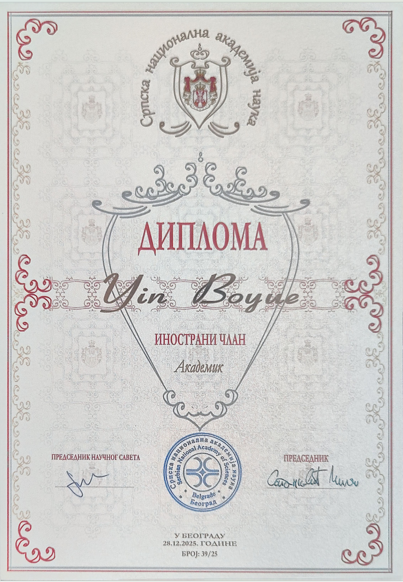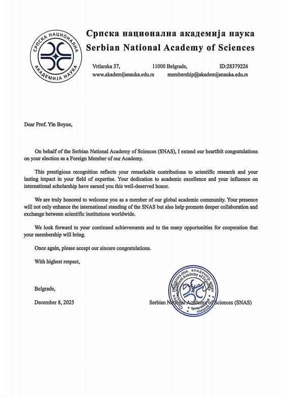 塞尔维亚国家科学院已专门向尹伯悦发来祝贺函,对其当选表示热烈祝贺,高度肯定了其在建筑科技领域的学术贡献,并期待未来能够与尹伯悦开展更多深度的学术合作,共同推动相关领域的科研进步与发展。